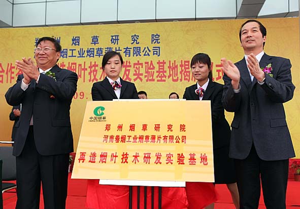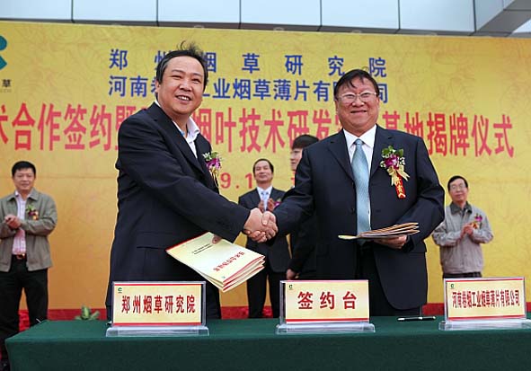 10月19日,我院與河南卷煙工業(yè)煙草薄片有限公司在許昌簽署技術(shù)合作協(xié)議,合力建設(shè)再造煙葉技術(shù)研發(fā)實(shí)驗(yàn)基地。閆亞明院長(zhǎng)與河南中煙副總經(jīng)理、薄片公司董事長(zhǎng)宋有申共同為實(shí)驗(yàn)基地揭牌。