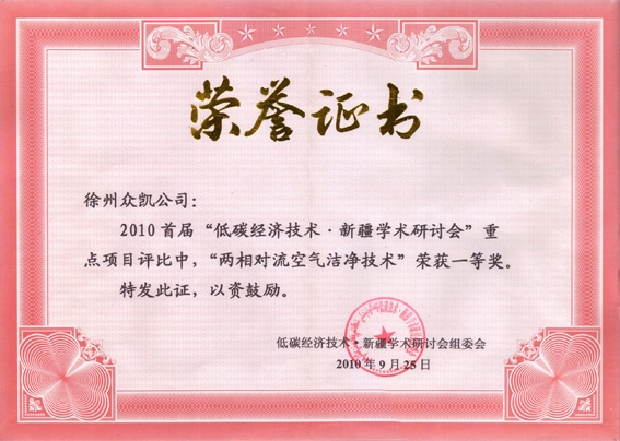 2010925日,由徐州眾凱公司自主研發(fā)的“兩相對(duì)流空氣潔凈技術(shù)”在2010屆“低碳經(jīng)濟(jì)技術(shù)·新疆學(xué)術(shù)研討會(huì)”重點(diǎn)項(xiàng)目評(píng)比中榮獲一等獎(jiǎng)。