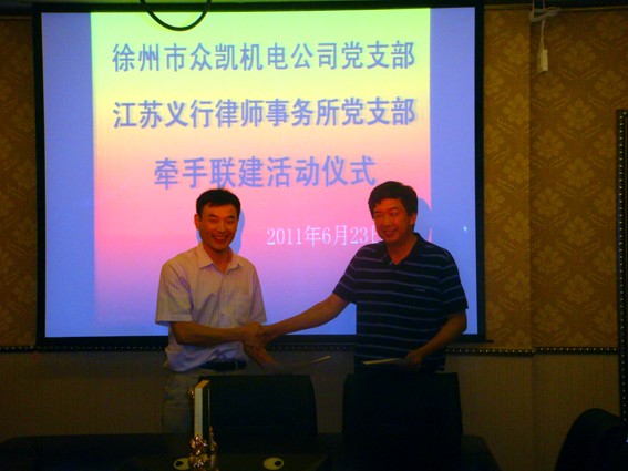 在喜迎中國共產黨成立90周年之際,徐州眾凱公司黨支部成員王總和江蘇義行律師事務所黨支部戴書記于6月23日分別代表各自黨支部,喜簽黨建共建協(xié)議,結成共建單位。并進行座談交流。