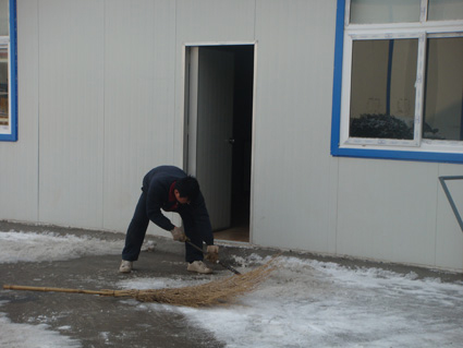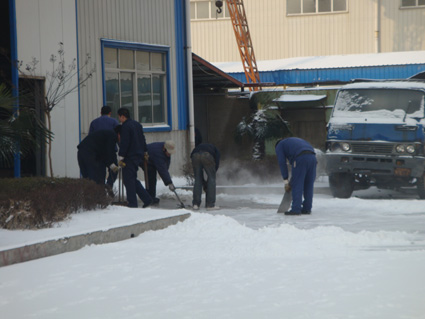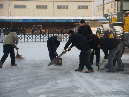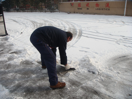 2月11日,徐州普降今冬第一場大雪。今天是上班最后一天,盡管道路很滑,大家依然按時到達公司。個別同事甚至一路步行過來上班。到公司后,發(fā)現(xiàn)早到的同事已經(jīng)開始自覺的清掃積雪。由于昨晚下了大量凍雨,地面早已結(jié)冰,積雪掃干凈后,地面依然很滑。大家八仙過海各顯神通,有的拿掃帚、有的用鐵鍬、有的用鐵棍、鐵板等各種工具來鏟除滑冰,清理路面,以確保大家的出行安全及生產(chǎn)活動的正常開展。